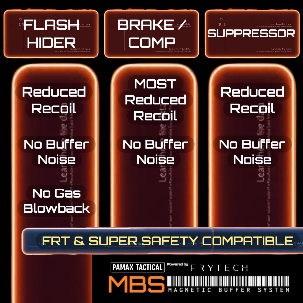 The Magnetic Buffer System (MBS) is a next-generation recoil management solution, combining patented Frytech Technology with enhanced spring engineering to deliver superior shooting performance for the AR15 platform.